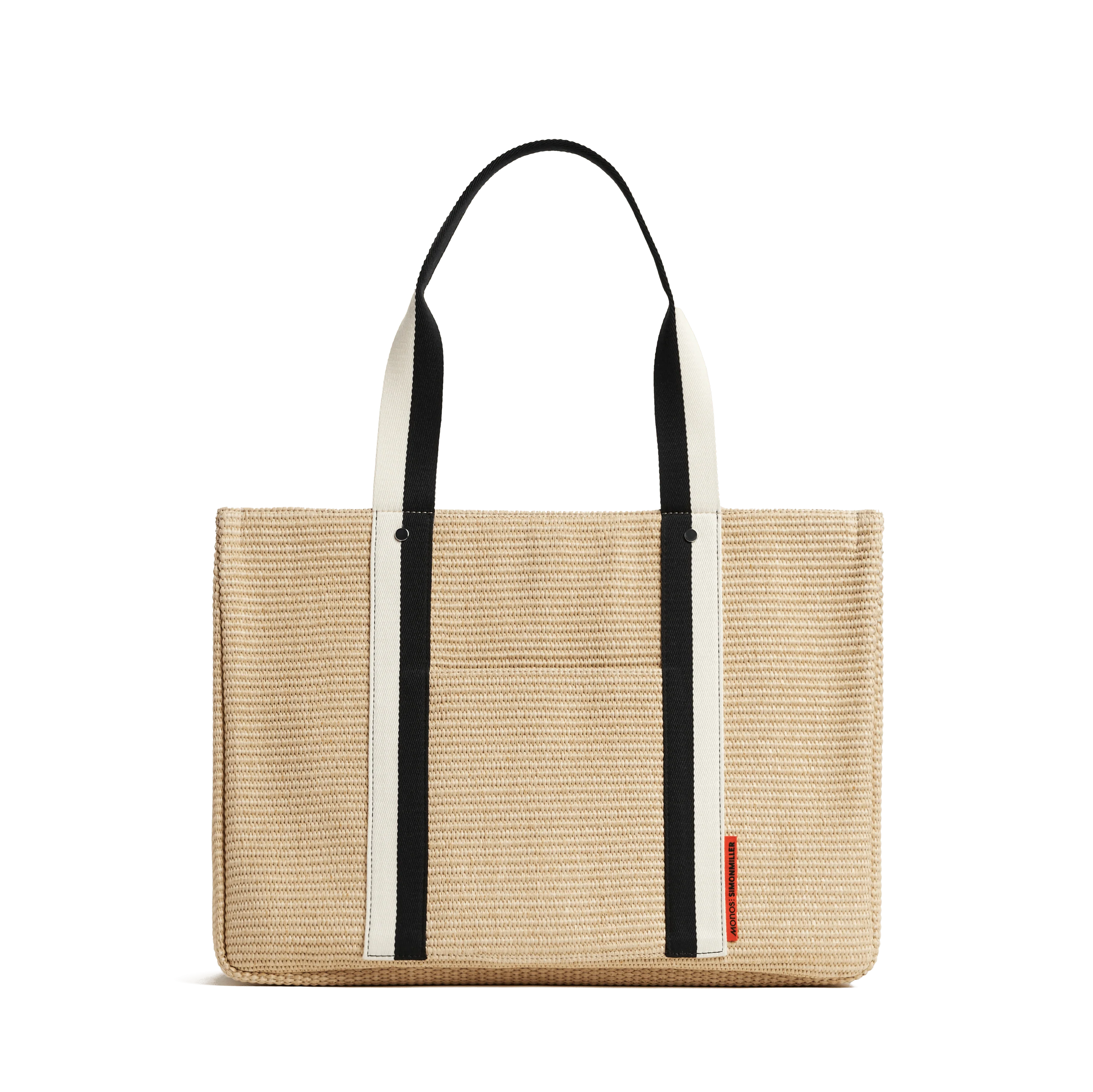 The Canopy Tote combines raffia construction, cotton straps, and a built-in trolley sleeve. Inside, a striped SIMONMILLER lining and pockets keep your laptop, water bottle, and essentials neatly organized – all in one playful, everyday carry.