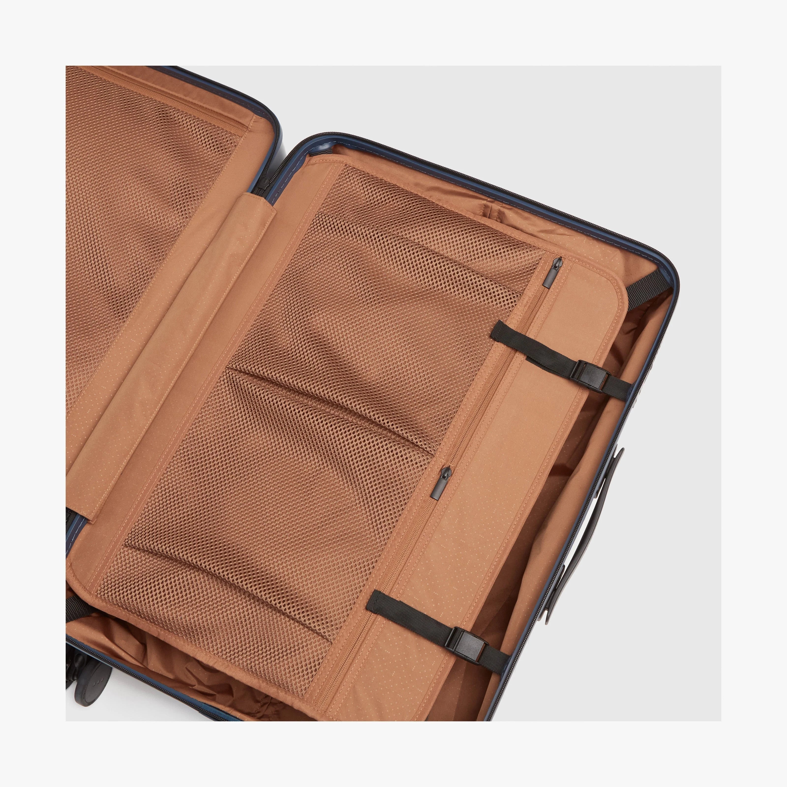 Outfitted with a high-quality polycarbonate shell, the Check-In Medium is dent-resistant, impact-friendly and virtually unbreakable. It features an ultra-sturdy telescopic handle, TSA-Accepted lock, whisper-quiet wheels, vegan leather details, and all-premium materials. Any of our Carry-On sizes can nest inside for easy storage when you’re not travelling.